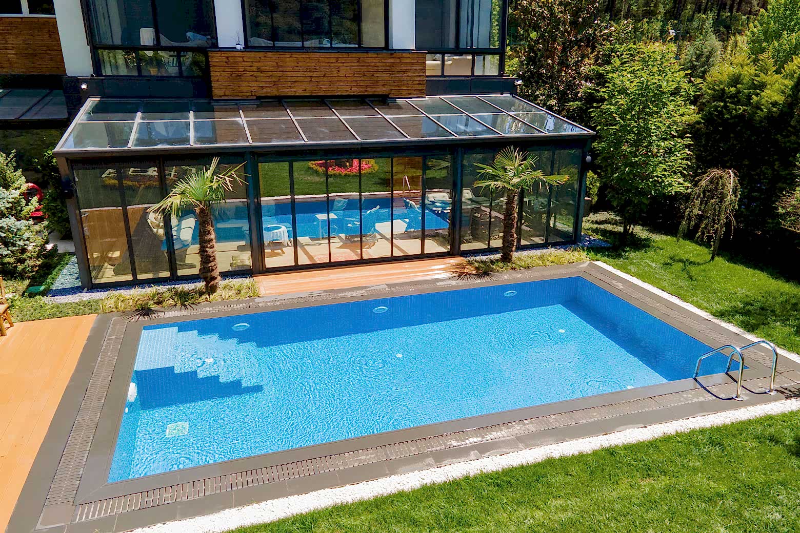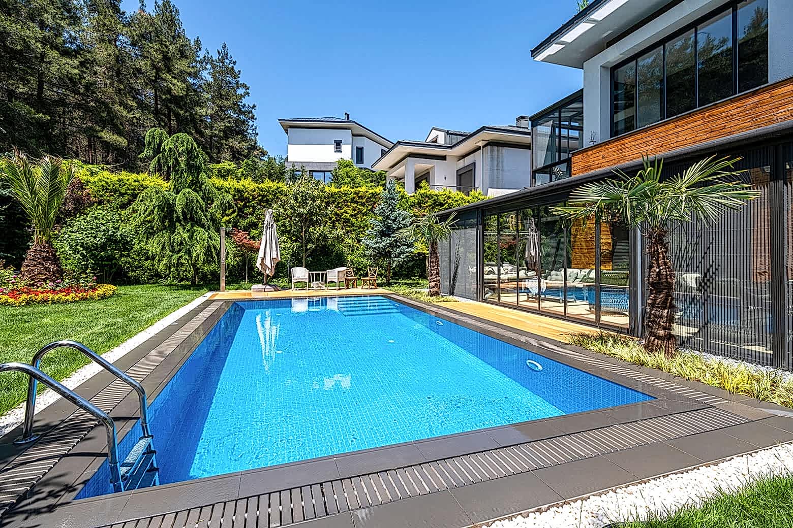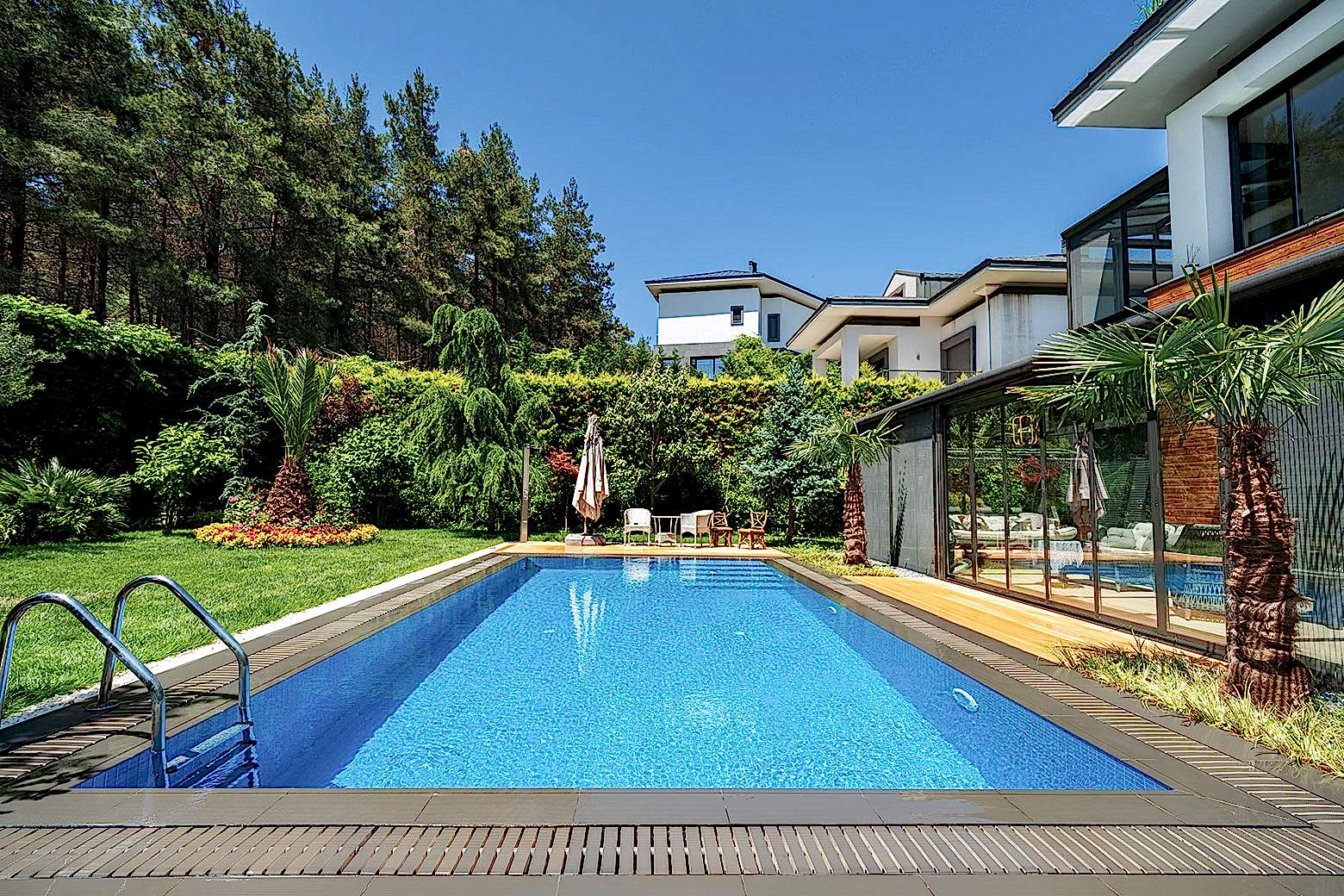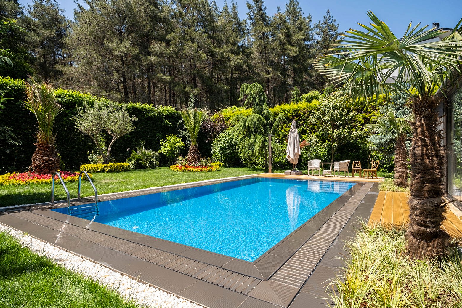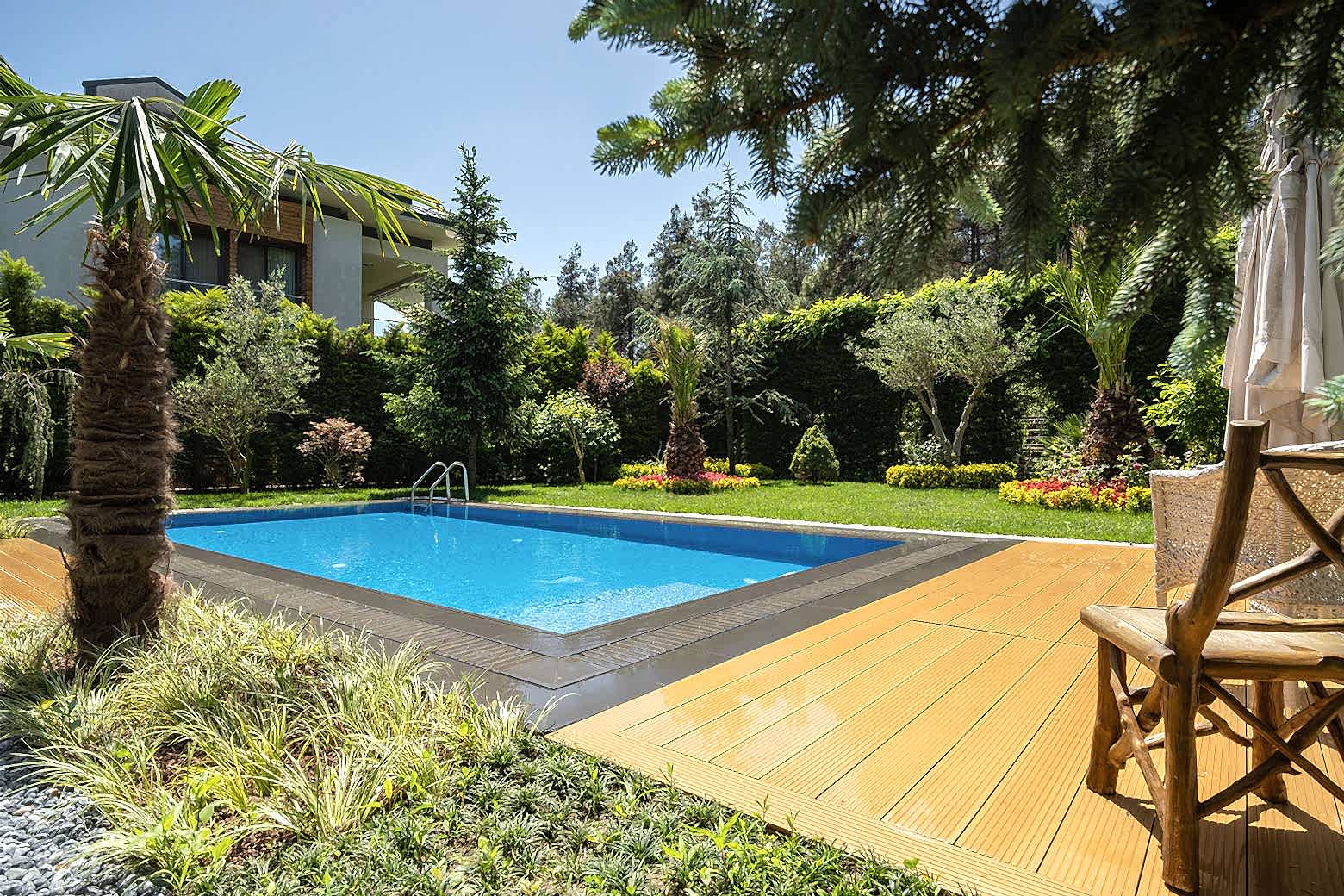 İstanbul Çekmeköy ’de yapmış olduğumuz 8x4 betonarme yüzme havuzu yapımı süreçlerinde firmamız havuz hafriyatı alınması betonarme alt yapının oluşturulması ve makine dairesi ve teknik odanın yapılması ve betonarme aşamanın bitiminden sonra havuz için dolgu yapılması ve arıtma sisteminin kurulumu tuz jeneratörü montajları firmamız tarafından yapılmıştır buna ek olarak havuz kenarı Kompozit deck uygulaması firmamızın ekipleri tarafından yapılmıştır havuz için ısıtma sistemi olarak havuz ısı pompası kullanılmıştır. Tüm havuz kaplama ürünleri porselen ızgara ve porselen tutamak tercih edilmiştir. Rıza bey ve ailesine güzel günlerde kullanması dileklerimizle