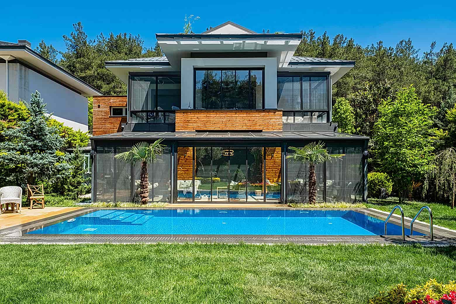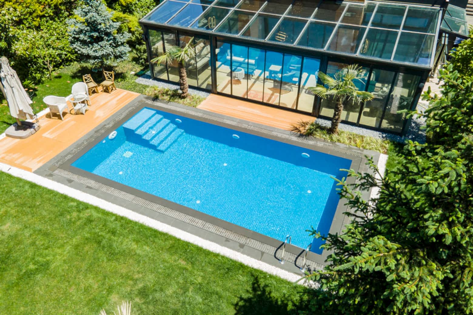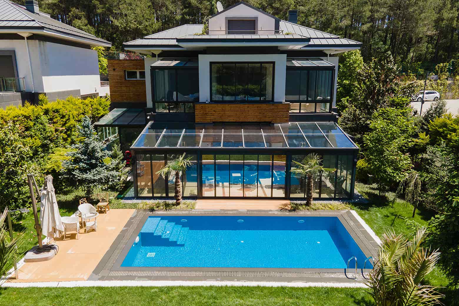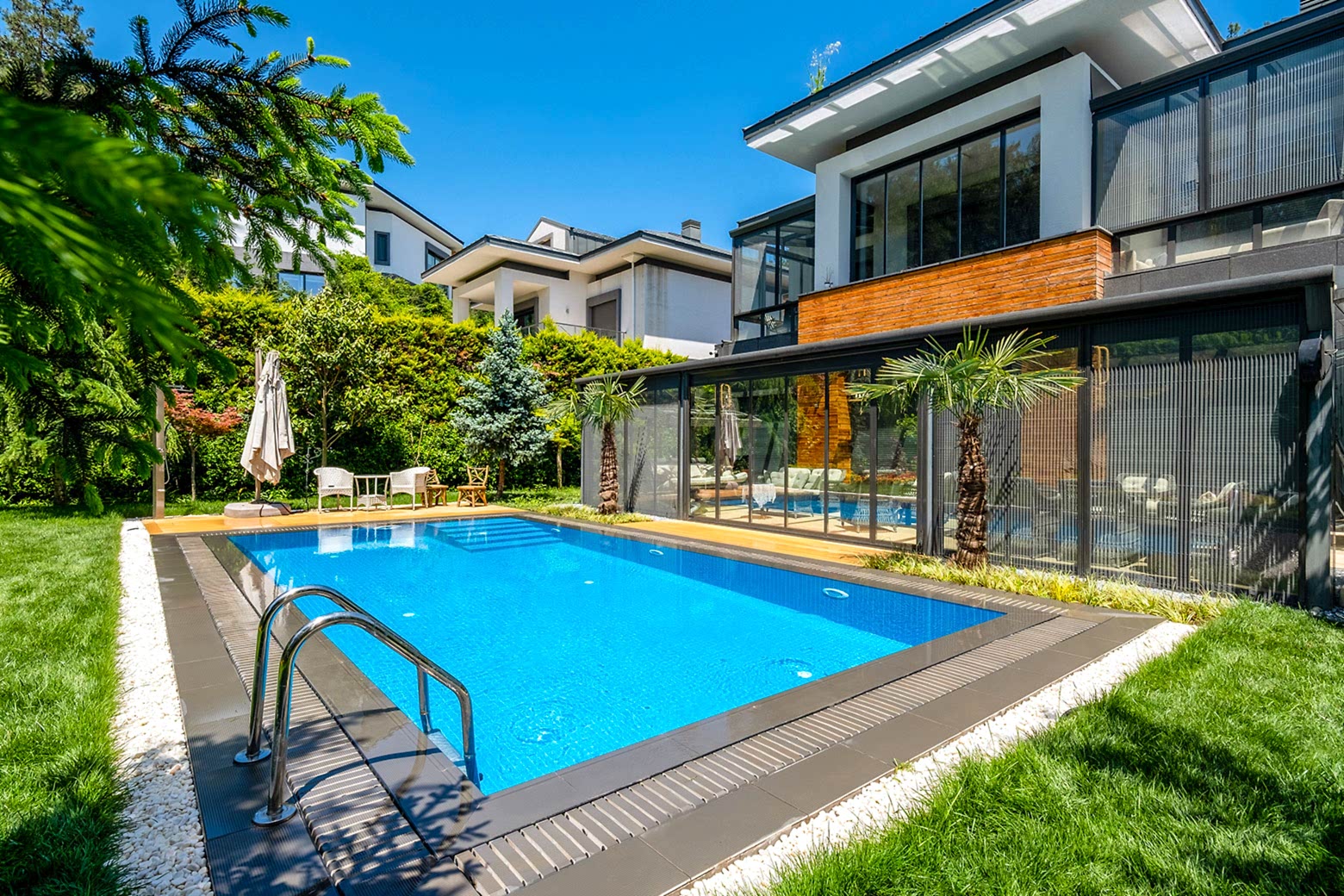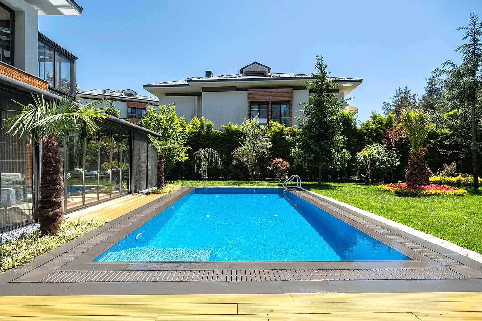 İstanbul Çekmeköy ’de yapmış olduğumuz 8x4 betonarme yüzme havuzu yapımı süreçlerinde firmamız havuz hafriyatı alınması betonarme alt yapının oluşturulması ve makine dairesi ve teknik odanın yapılması ve betonarme aşamanın bitiminden sonra havuz için dolgu yapılması ve arıtma sisteminin kurulumu tuz jeneratörü montajları firmamız tarafından yapılmıştır buna ek olarak havuz kenarı Kompozit deck uygulaması firmamızın ekipleri tarafından yapılmıştır havuz için ısıtma sistemi olarak havuz ısı pompası kullanılmıştır. Tüm havuz kaplama ürünleri porselen ızgara ve porselen tutamak tercih edilmiştir. Rıza bey ve ailesine güzel günlerde kullanması dileklerimizle