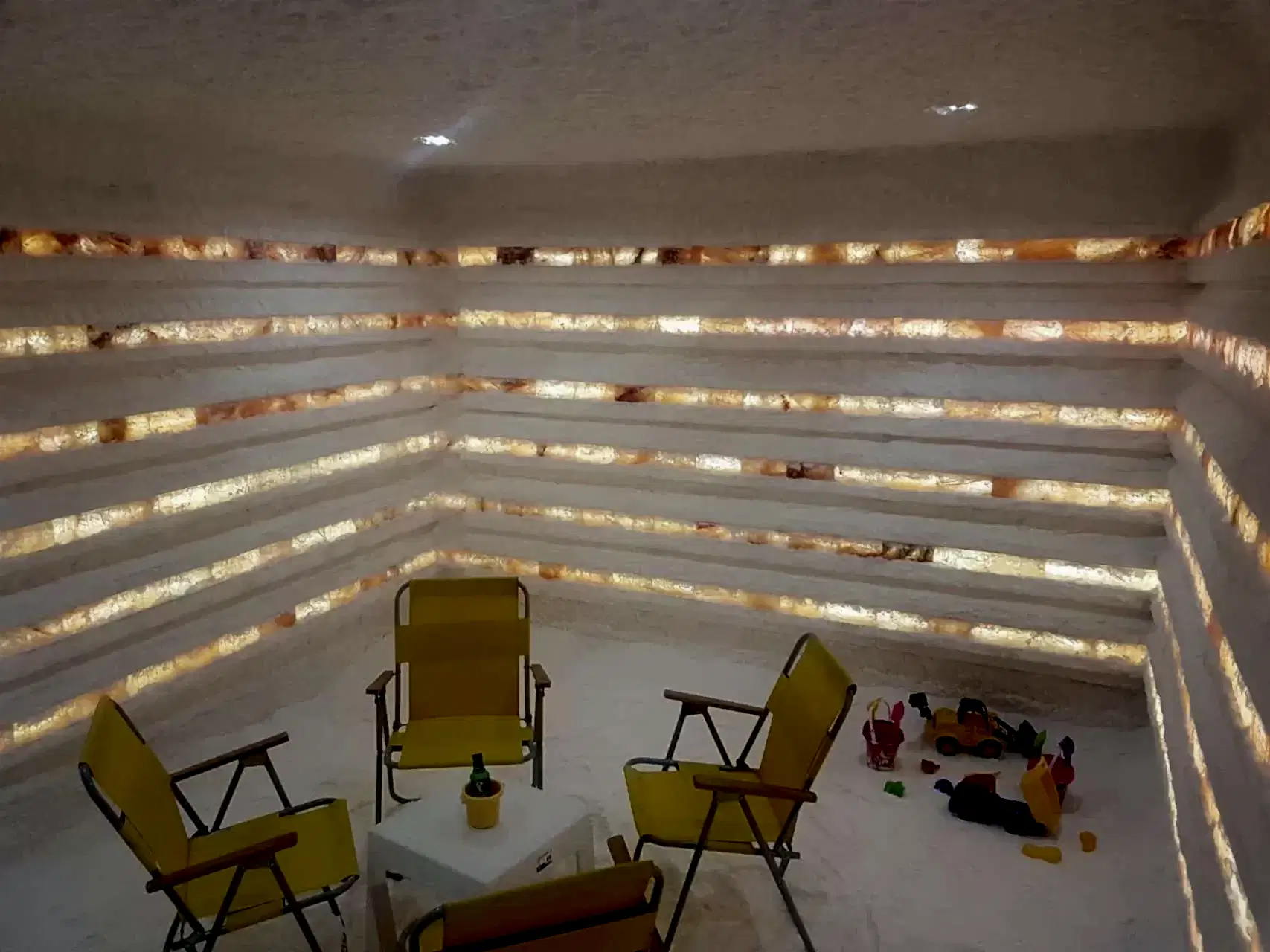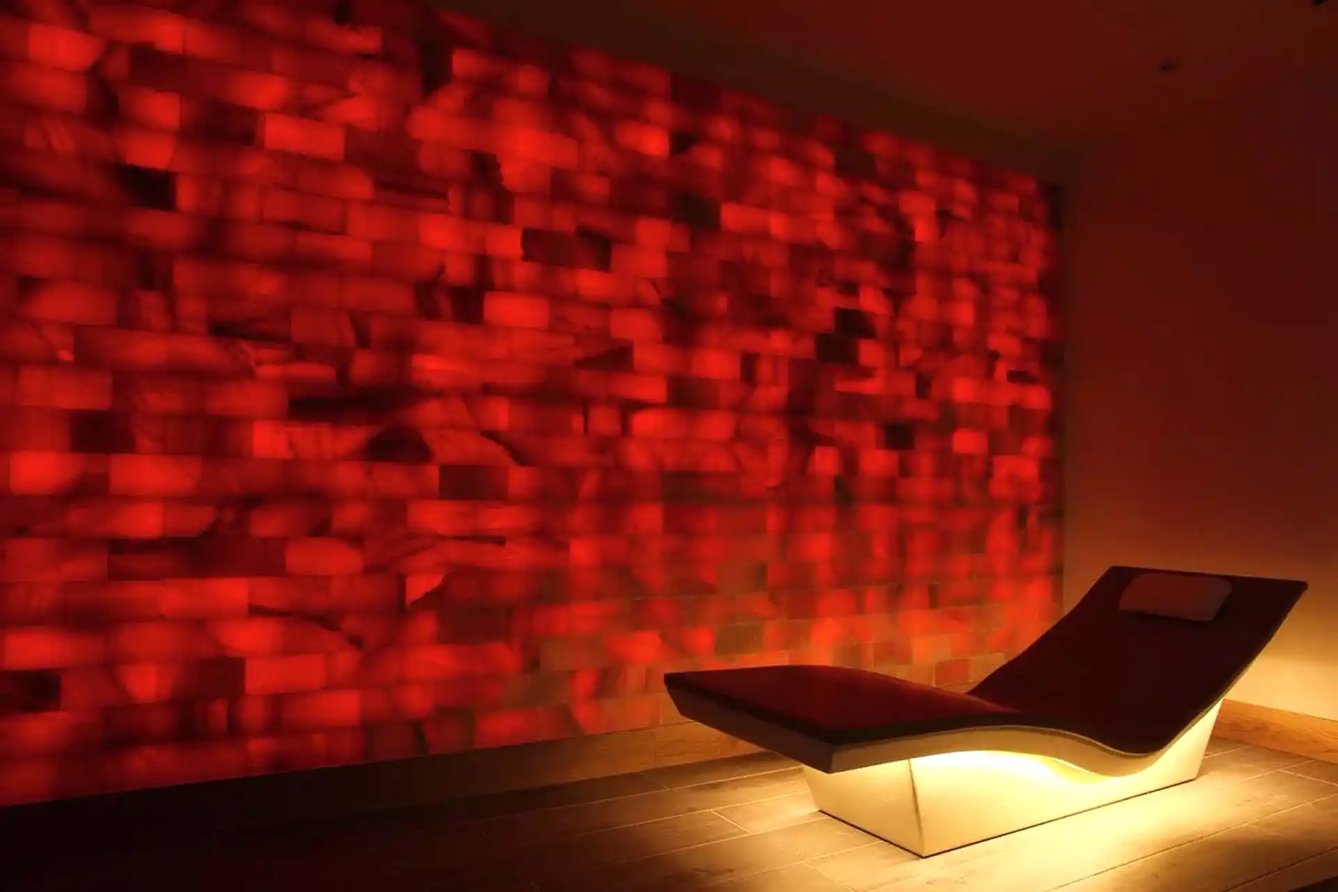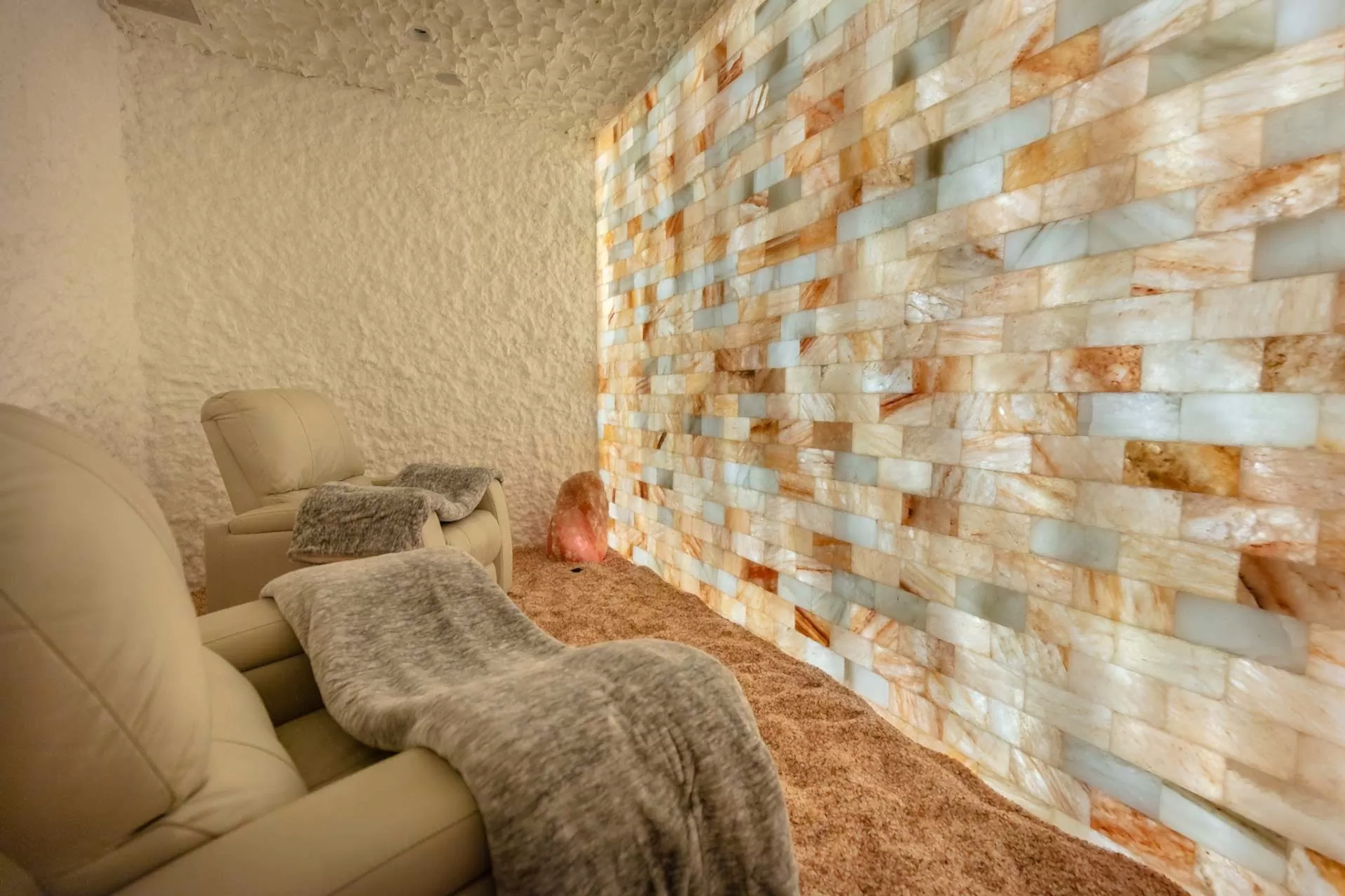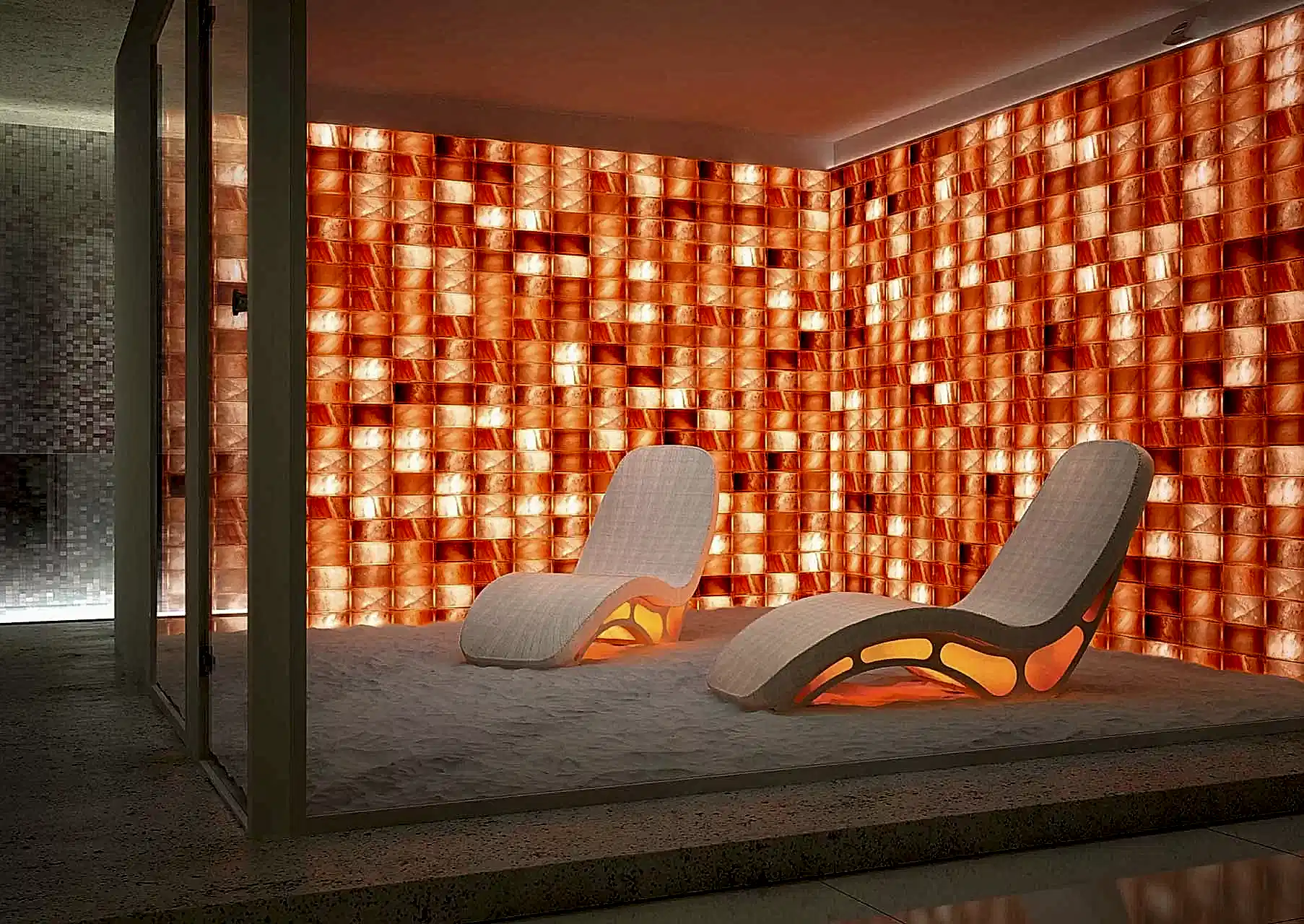 Modern bir tuz odası, minimalist çizgiler ve doğal renk paletleriyle harmanlanarak ferah bir atmosfer sunar. Özel aydınlatma uygulamaları, tuz bloklarının doğal dokusunu ve sıcak tonlarını ön plana çıkarırken, organik formdaki mobilyalar ve doğal materyaller, kullanıcıların rahatlamasını sağlayacak bir estetik ortam yaratır.